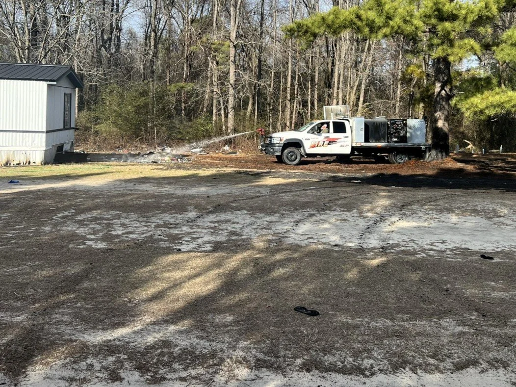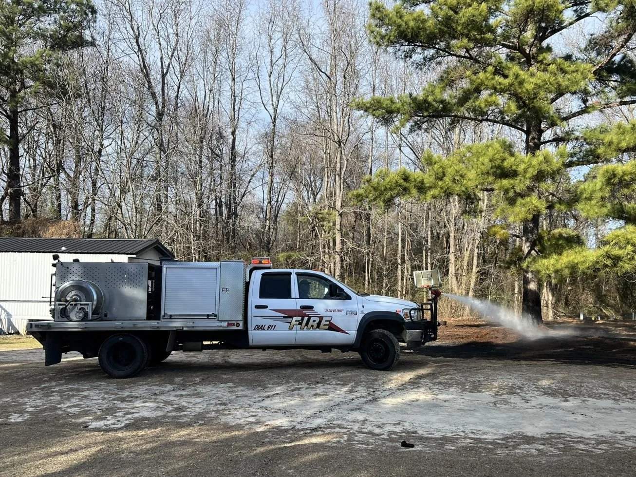 Upon arrival, Brush 23 encountered a wind‑driven grass fire threatening a nearby mobile home and extending toward the wood line. Firefighters deployed the apparatus’ front turret and successfully extinguished the fire before it could ignite the mobile home or spread further into the wooded area.