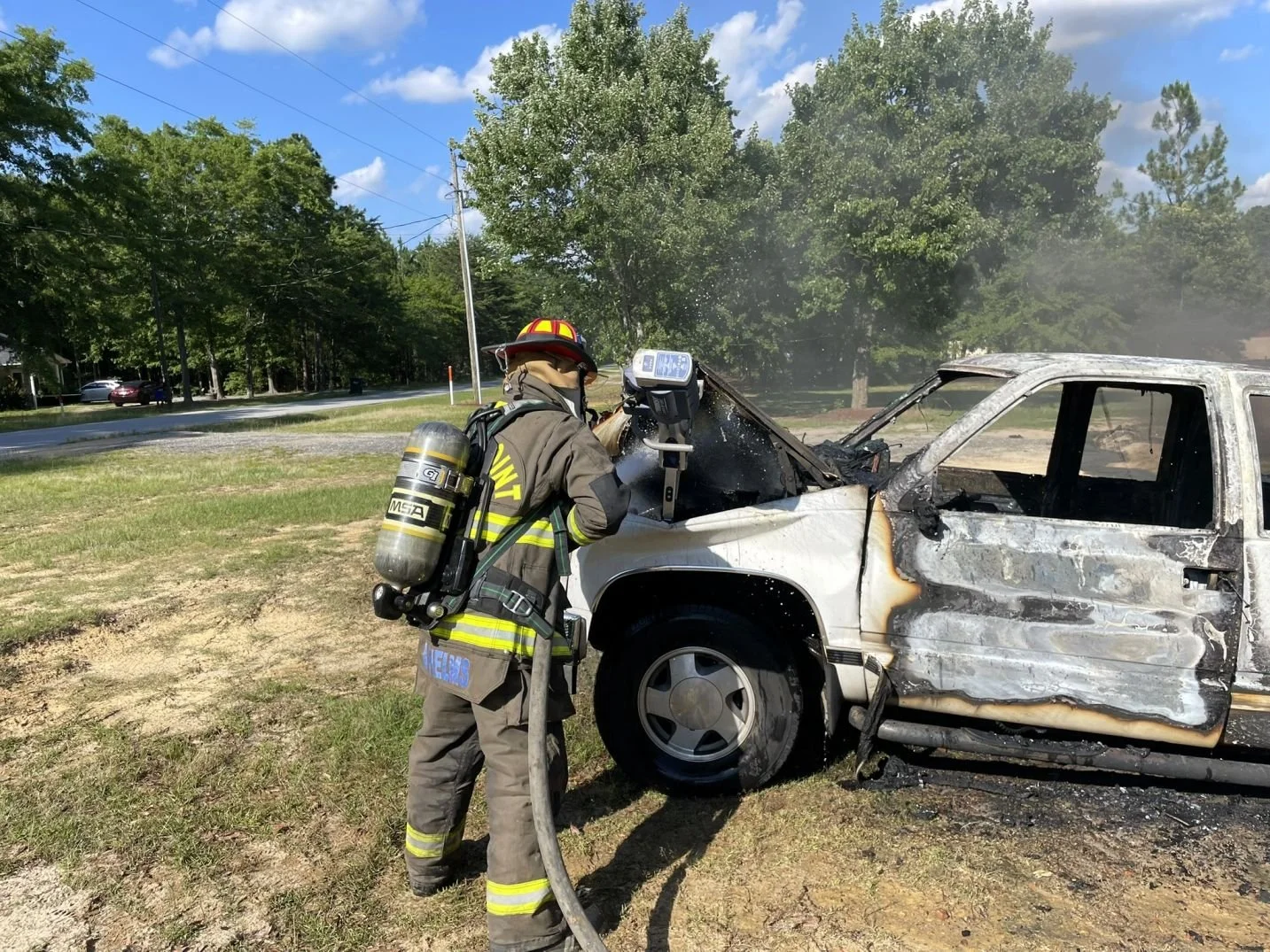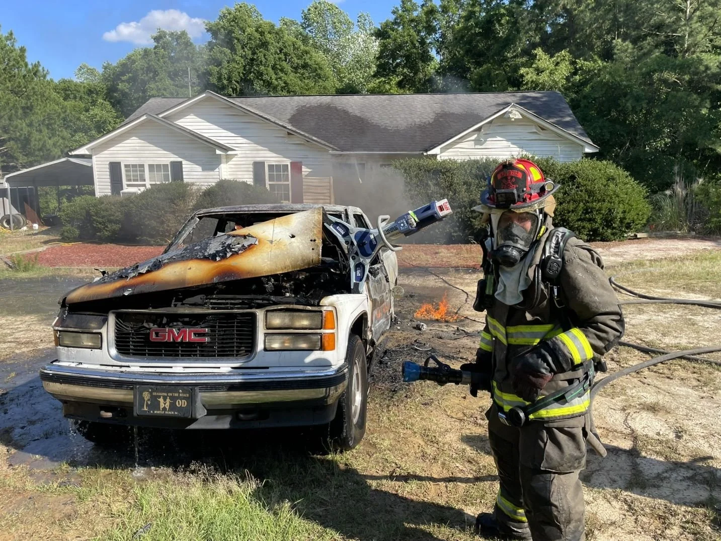Firefighters deployed a hose line to cool the affected siding, then shifted efforts to extinguishing the blaze consuming the pickup truck. As the fire had damaged the hood release mechanism, firefighters utilized the "Jaws of Life" to access the engine compartment.