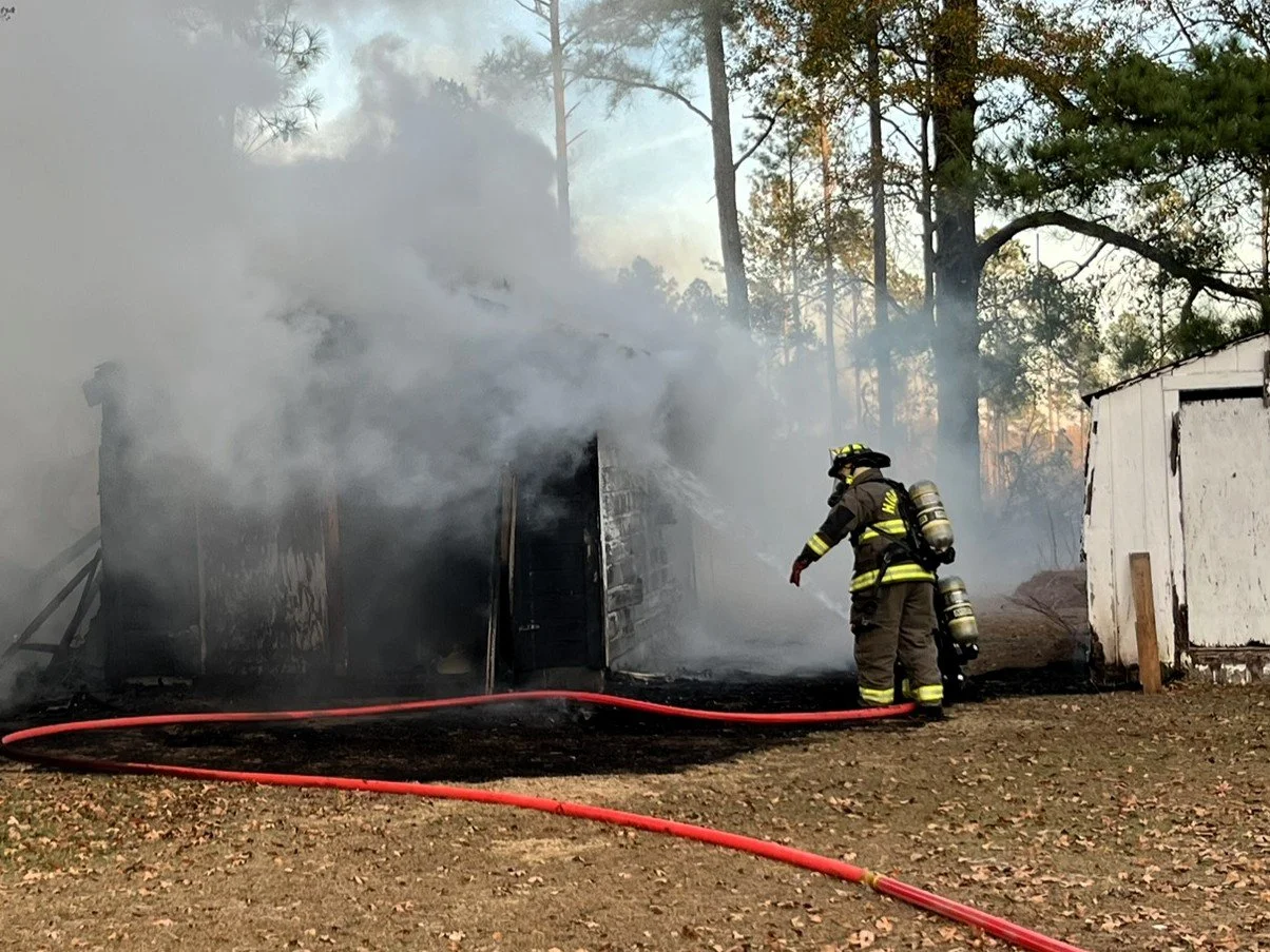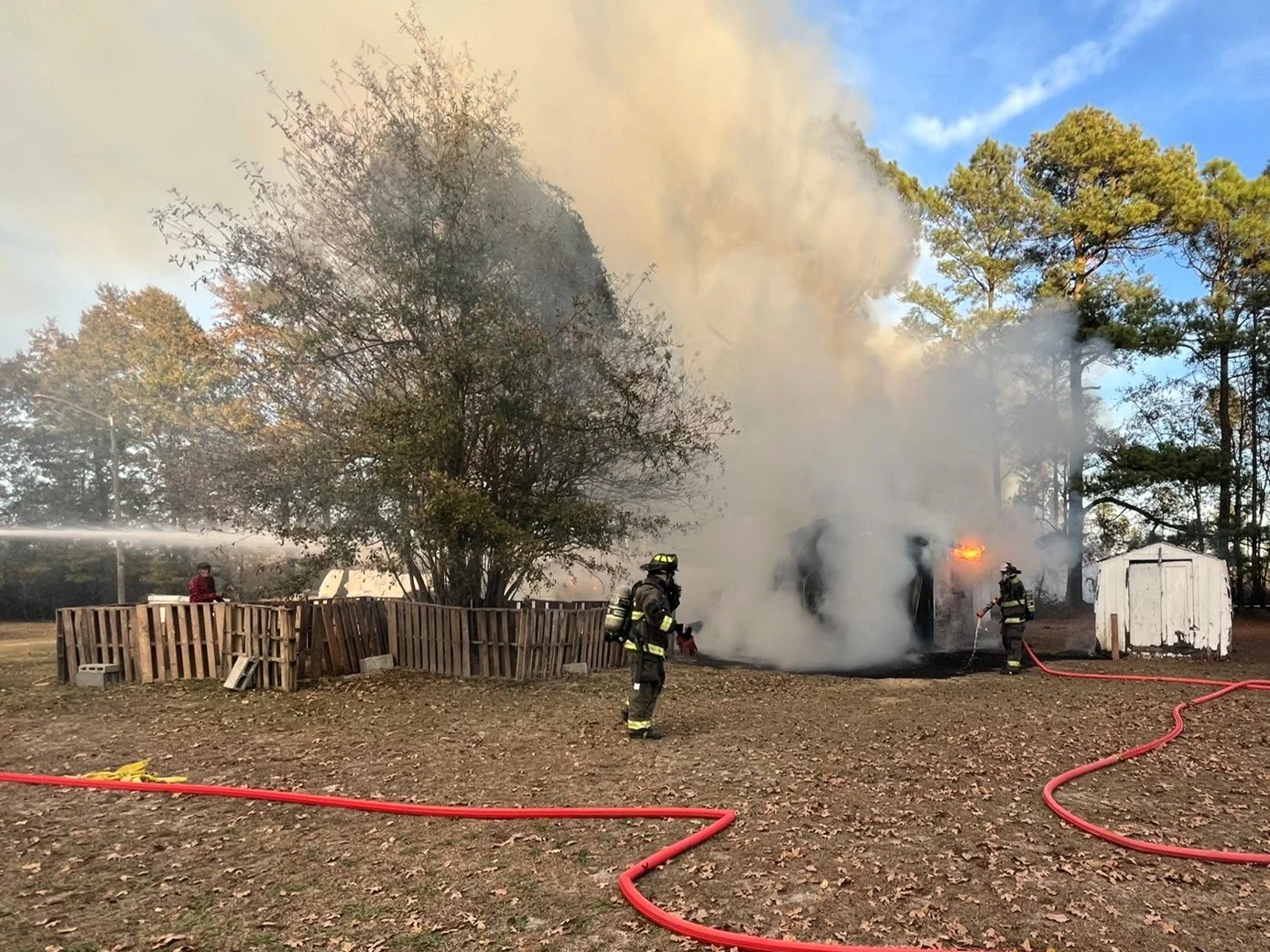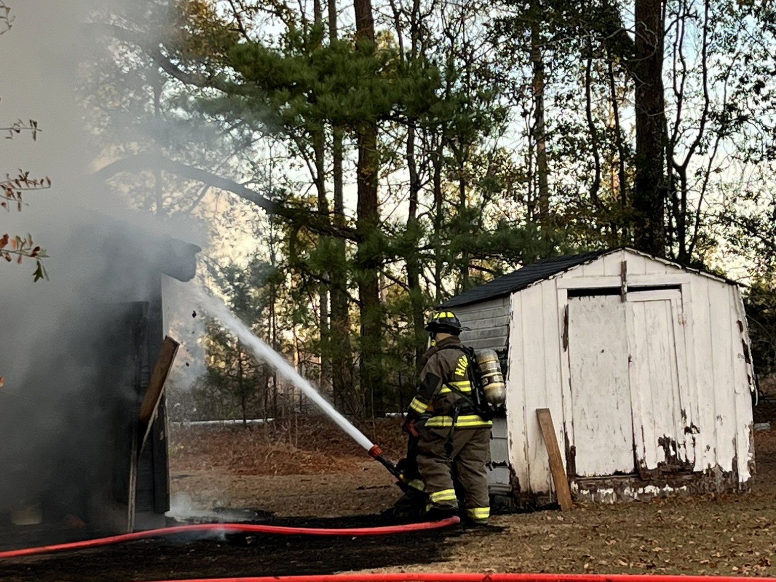 Upon arrival, Engine 11 and Engine 31 found a storage building and a well pump house burning, with another storage building beginning to ignite. Engine 11 utilized its deck gun to knock down a large portion of the fire, while firefighters from Engine 31 advanced a hose line to continue suppression efforts. Pageland Fire and Sandhill Fire provided additional water supply and manpower to support the operation.