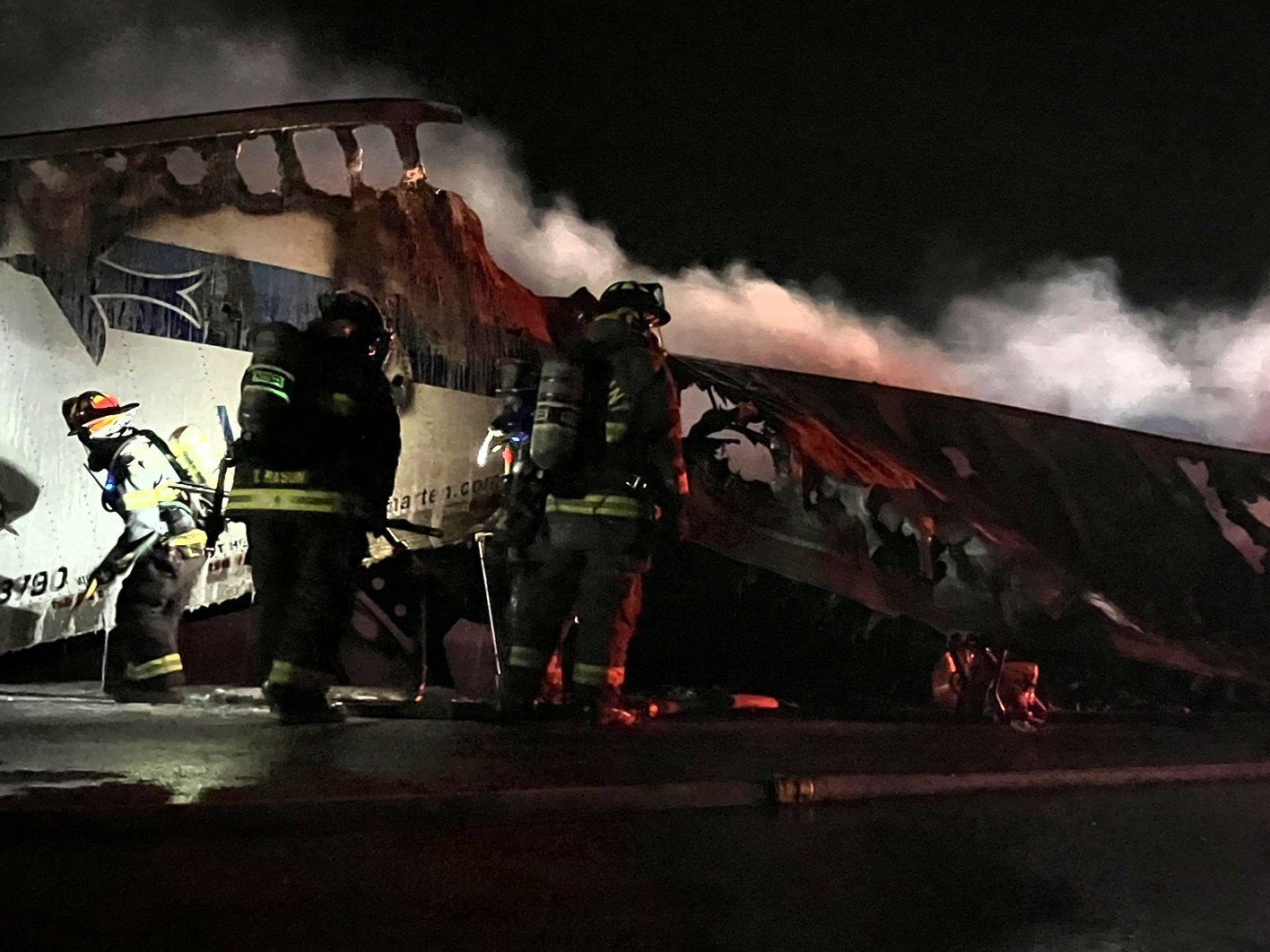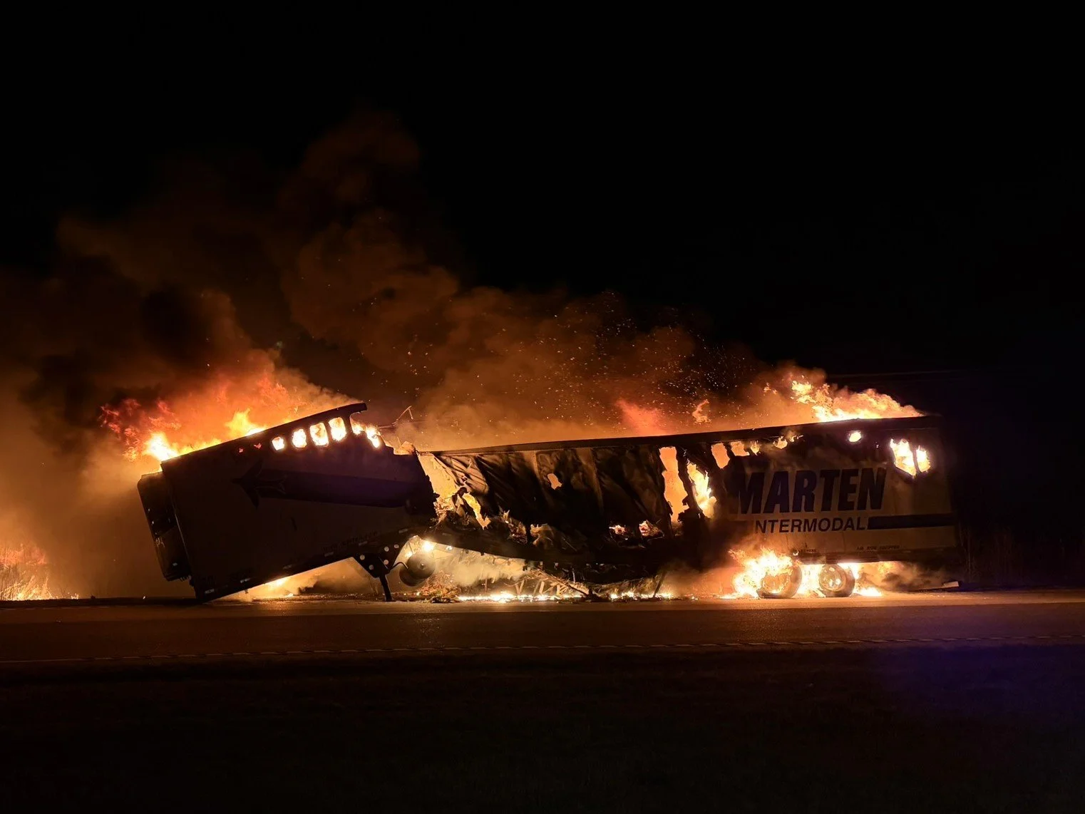 Preliminary investigation suggests the fire originated in the area of the trailer suspension.