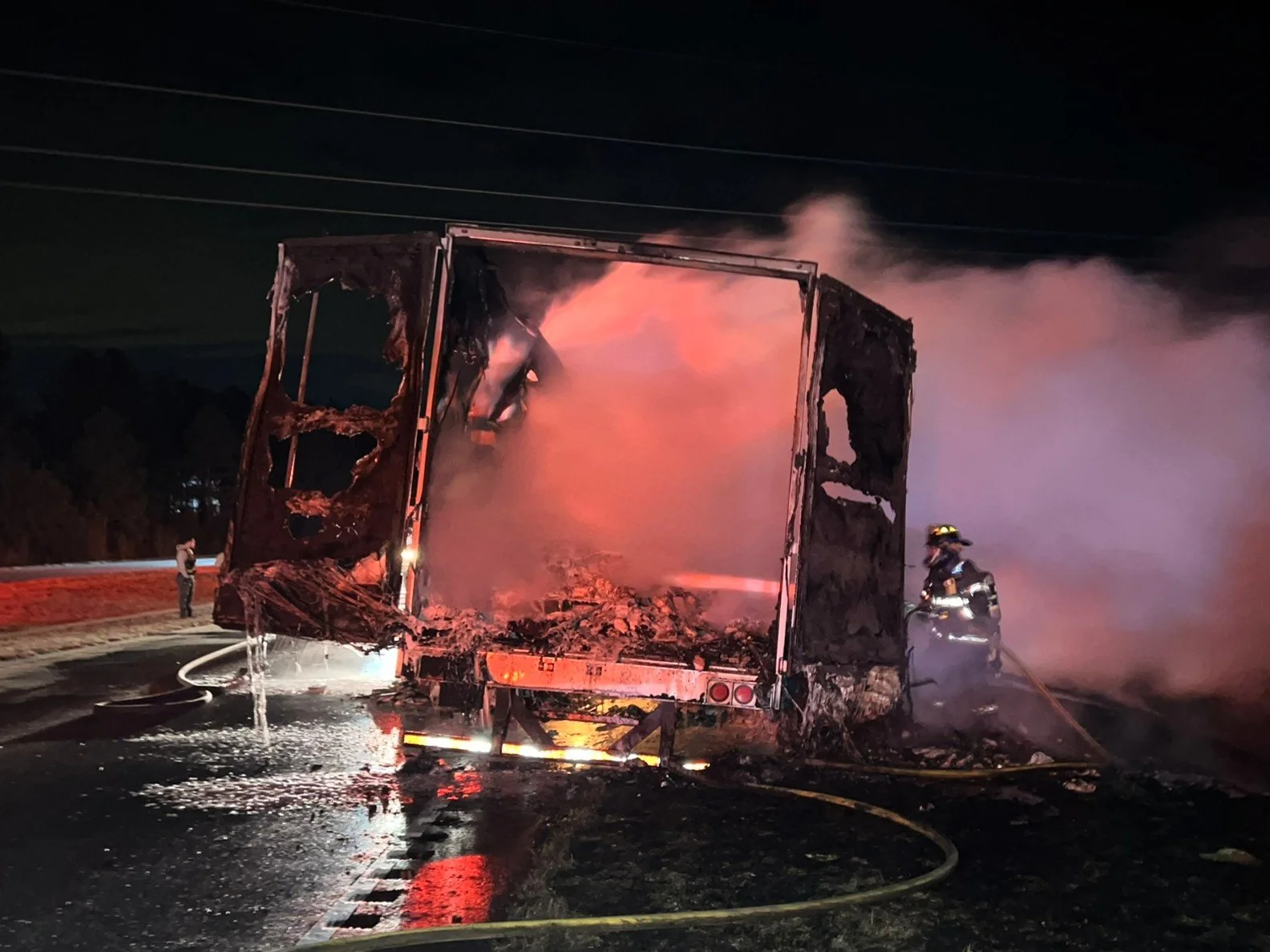Once the main body of the trailer fire was under control, crews switched to a water foam solution to saturate and seal the burning food, ensuring complete extinguishment. Firefighters returned to their stations at 2:30 AM and continued working until 4:00 AM, cleaning and refilling air packs and washing and repacking 600 feet of fire hose.